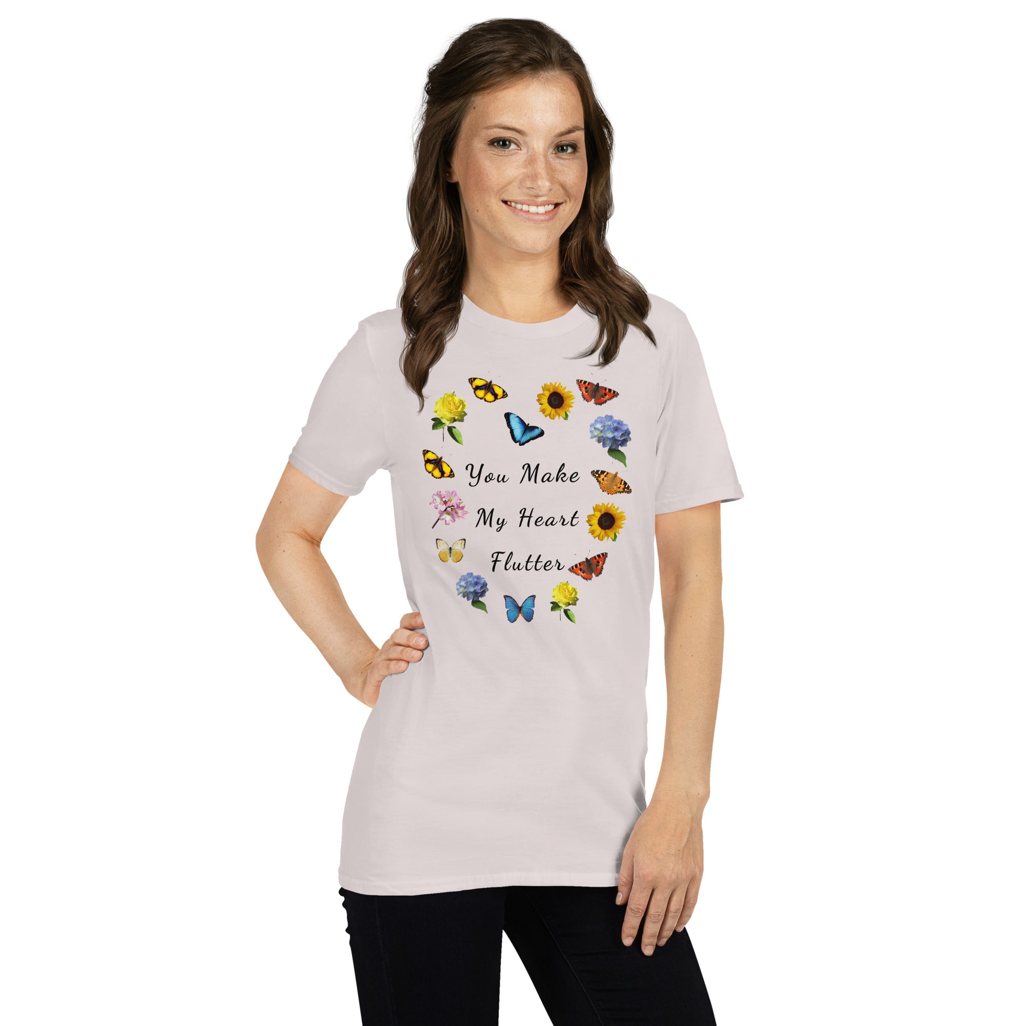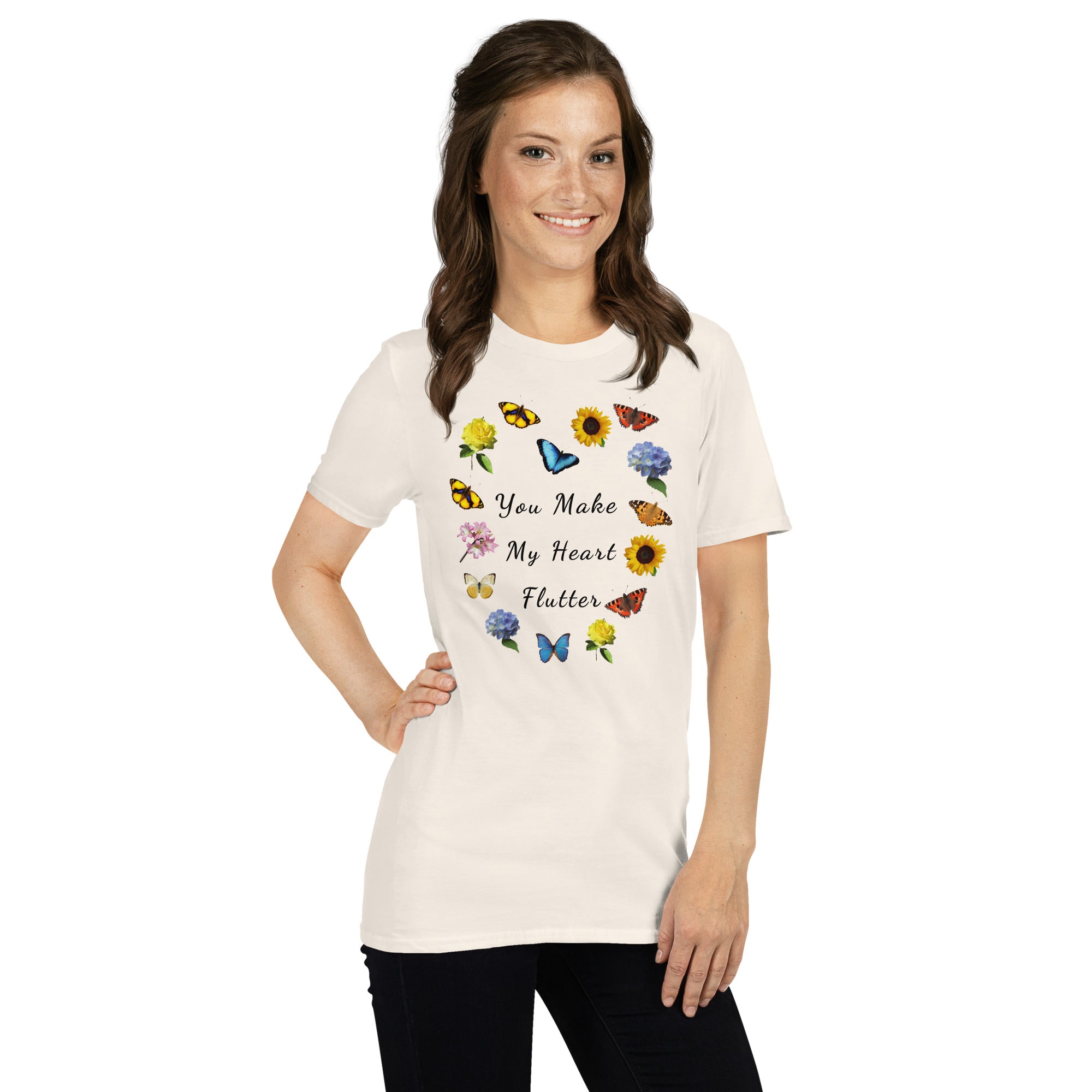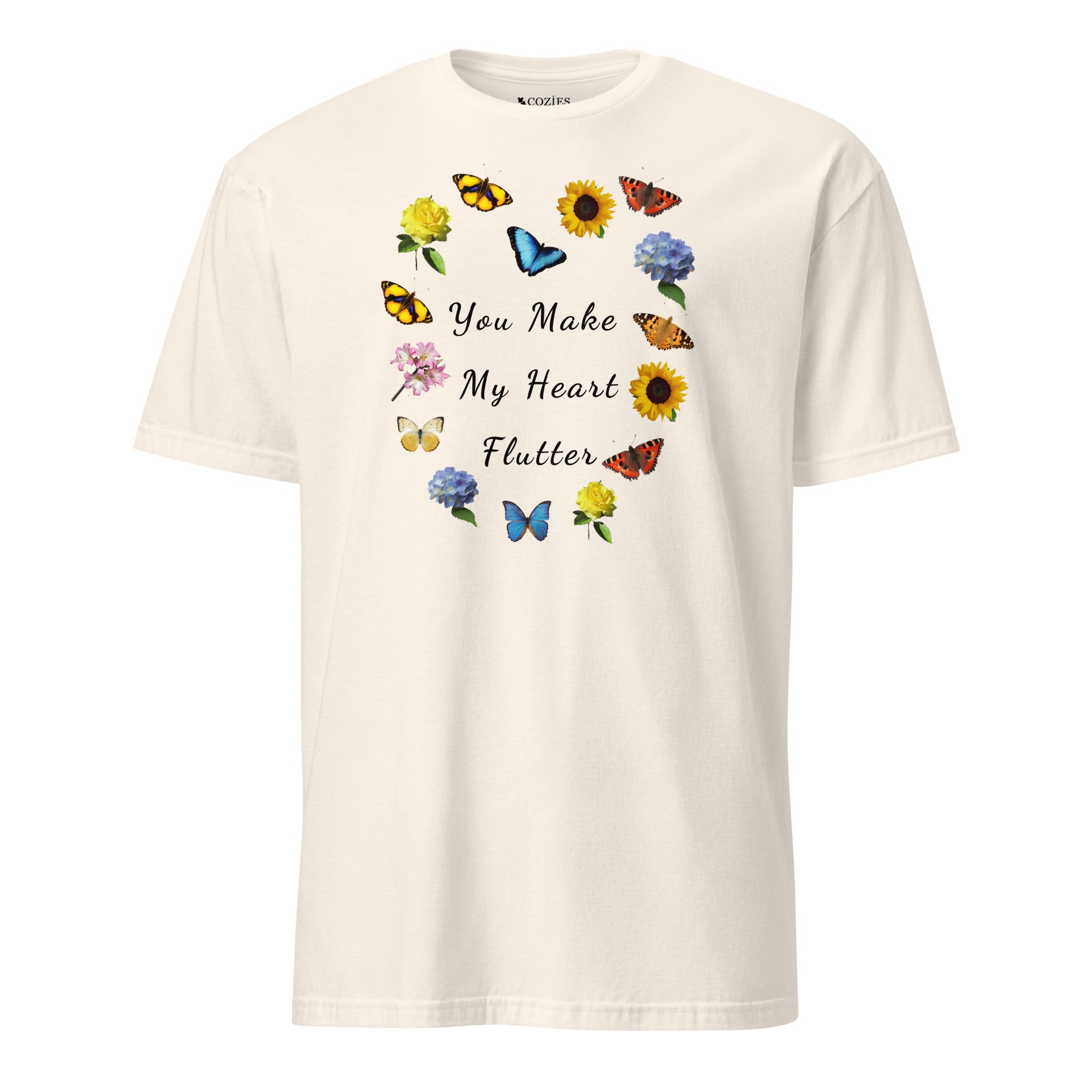 Bright butterflies and blooming flowers frame the sweet message “You Make My Heart Flutter” — a cheerful graphic tee made to spread smiles and sunshine. Crafted from 100% USA Grown Cotton and cotton/poly blends for all-day comfort.